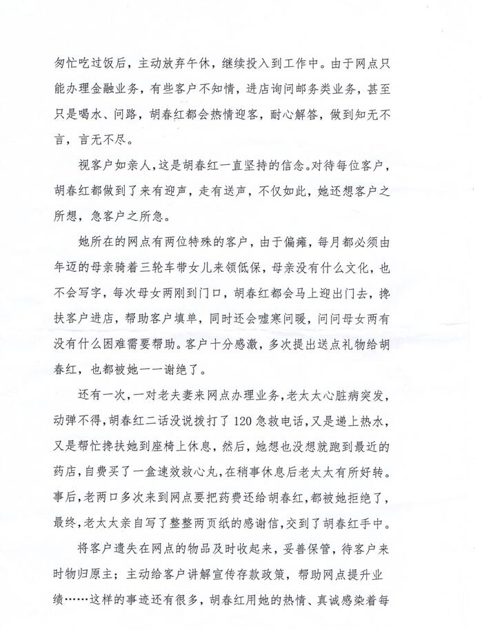 還有一次,一對老夫妻來網(wǎng)點辦理業(yè)務,老大大心臟病突發(fā),動彈不得,胡春紅二話沒說撥打了120急救電話,又是遞上熱水又是幫忙攙扶她到座椅上休息,然后,她想也沒想就跑到最近的藥店,自費買了一盒速效救心丸,在稍事休息后老太大有所好轉事后,老兩口多次來到網(wǎng)點要把藥費還給胡春紅,都被她拒絕了,最終,老大大親自寫了整整兩頁紙的感謝信,交到了胡春紅手中。將客戶遺失在網(wǎng)點的物品及時收起來,妥善保管,待客戶來時物歸原主;主動給客戶講解宣傳存款政策,幫助網(wǎng)點提升業(yè)績……這樣的事跡還有很多,胡春紅用她的熱情、真誠感染著每一位前來辦理業(yè)務的客戶。翻開客戶意見薄,里面密密麻麻地記載了客戶對于胡春紅的贊美與好評,每當想到自已的努力可以真正幫助到客戶,滿滿的成就感就會在胡春紅的心頭漾開,而這也成了她堅持下去的動力。“我在這里上班,我就是這的一份子,我愿意盡我的微薄之力,讓網(wǎng)點辦得更好!”這是胡春紅的心里話,雖然樸實,卻很感人,一如她在這平凡的崗位上,干出的不平凡的成績!